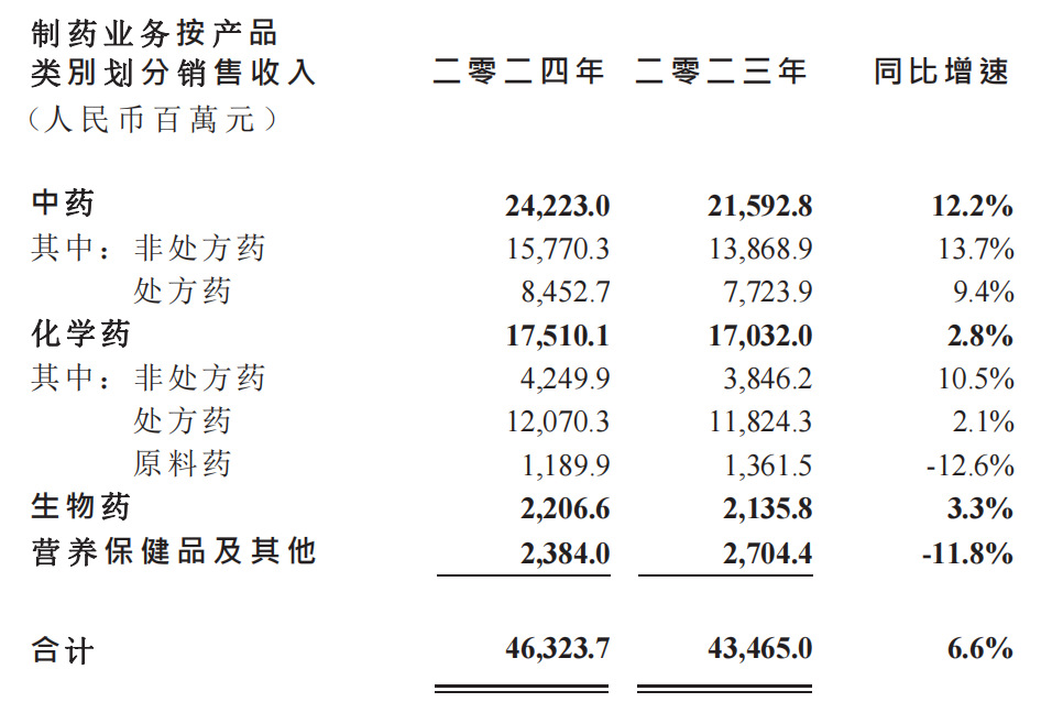 从华润医药2024年的业绩报告可以看出,在制药方面,其化学药与生物药增速相对滞后于中药板块。